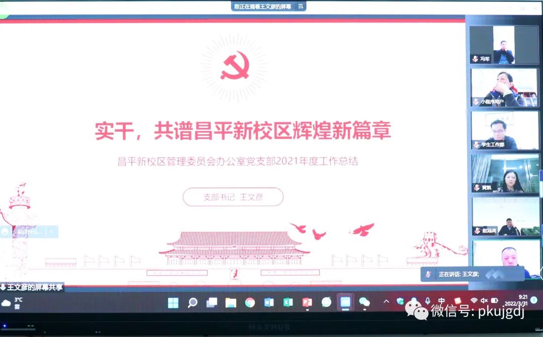 按照学校党委相关部署,2022年3月31日上午,机关党委召开2021年度党支部书记抓基层党建现场述职评议暨党建工作交流会,会议采用线上线下相结合的方式进行。北京大学党委副书记安钰峰与机关党委委员、机关工会委员、机关团总支成员、机关各部门党组织书记等共50余人参加。会议由机关党委副书记袁红利主持。