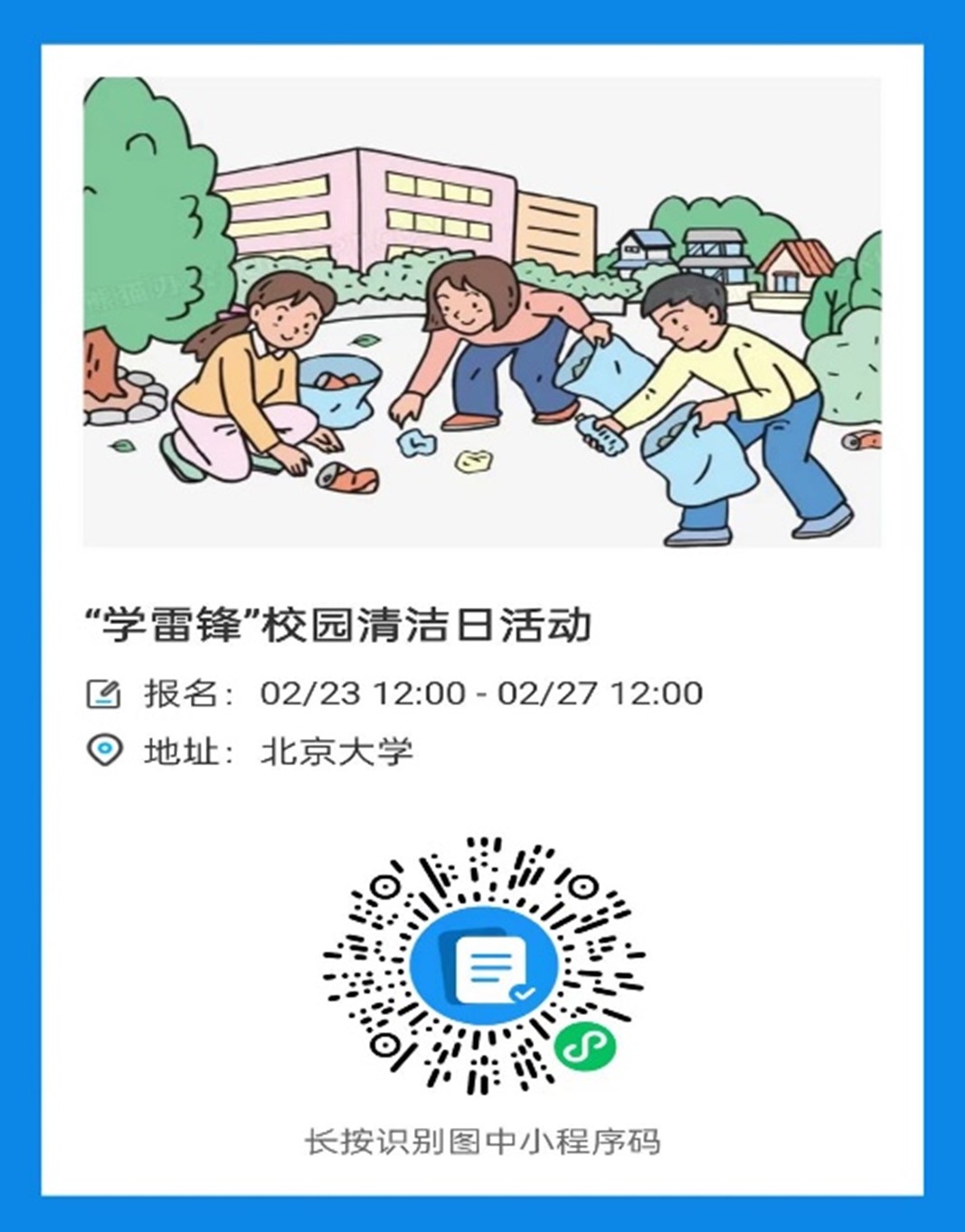 1.中午12:00西门内集合,2-3人一组,为每组发放长夹子、垃圾袋及劳保手套