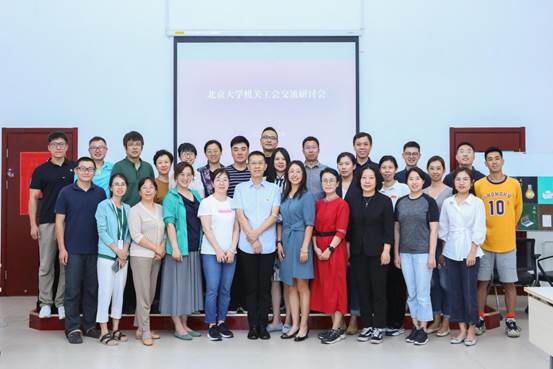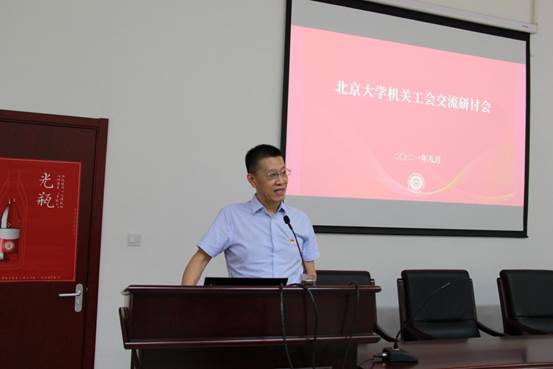 2021年9月16日下午,北京大学机关工会在勺园职工之家召开本学期第一次工会工作交流研讨会。机关党委书记刘旭东、副书记袁红利以及机关工会全部27个部门工会小组负责人参加,会议由机关工会主席田越主持。