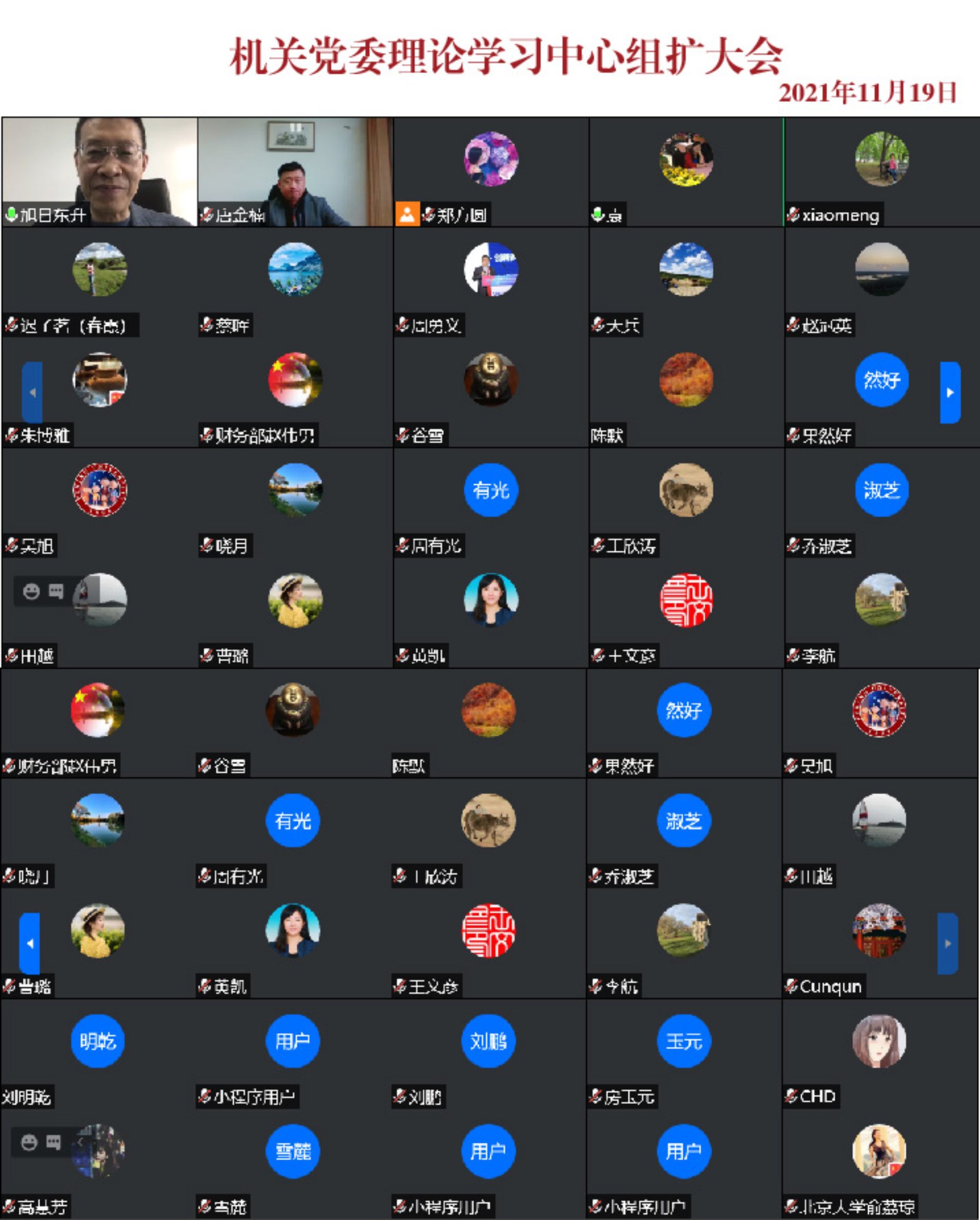 11月19日,北大机关党委通过线上会议的方式召开理论学习中心组扩大会,深入传达学习党的十九届六中全会精神并提出学习要求,进一步研究推进落实学校党委巡察反馈意见的整改方案、党史学习教育实施方案相关任务;同时,开展领导班子年度述职测评。机关党委领导班子成员与委员、机关工会和机关团总支负责人、机关各部门党支部书记或支部委员参加会议。会议由机关党委书记刘旭东主持。