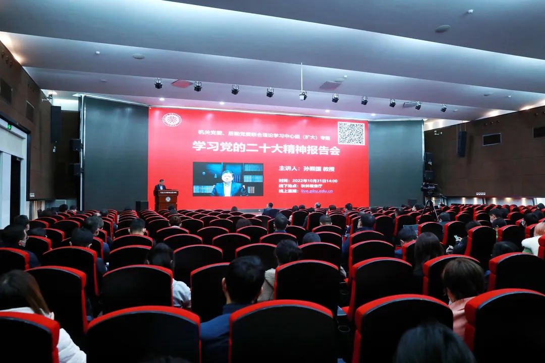 为深入学习宣传贯彻党的二十大精神,把全党全国各族人民的思想统一到党的二十大精神上来,把力量凝聚到党的二十大确定的各项任务上来,10月31日,机关党委、后勤党委在国际关系学院秋林报告厅联合举办理论学习中心组(扩大)专题学习党的二十大精神报告会,邀请习近平新时代中国特色社会主义思想研究院常务副院长孙熙国教授做理论辅导。校务委员会副主任兼秘书长、工会主席安钰峰,学校党委委员、后勤党委书记张念梅,后勤党委副书记杨爱民、副书记兼纪委书记宋飞,机关党委副书记袁红利,燕园街道党工委书记、公寓服务中心主任姜晓刚,校友工作办公室主任李文胜等现场参加报告会。机关和后勤党委委员、工会成员、团总支成员,各党支部书记、副书记、支部委员,近期发展对象、入党积极分子等200余位老师通过线上线下听取了报告,来自校友办、燕园街道、计算中心的同志们也一同参加学习。报告会由机关党委书记刘旭东主持。