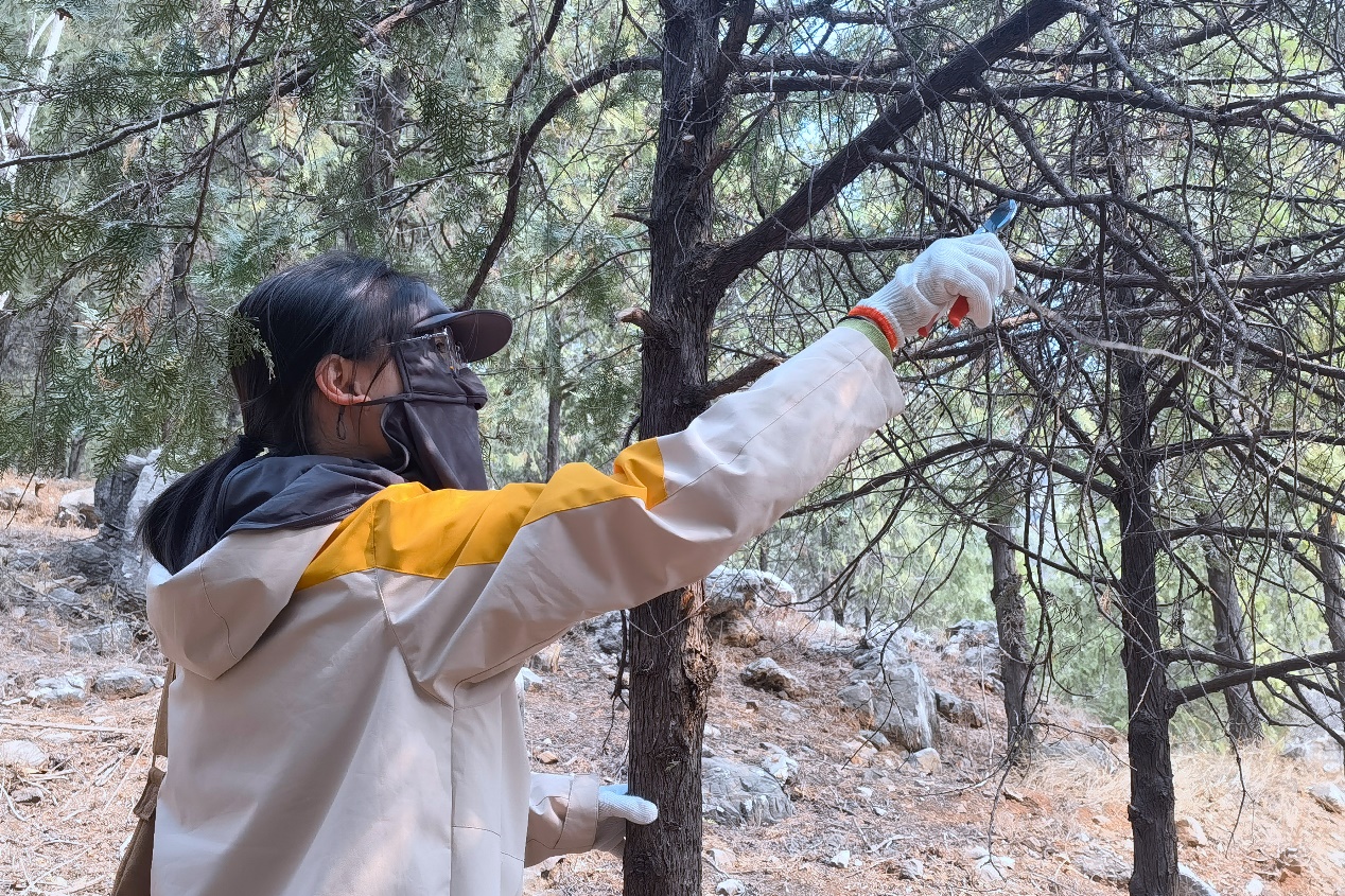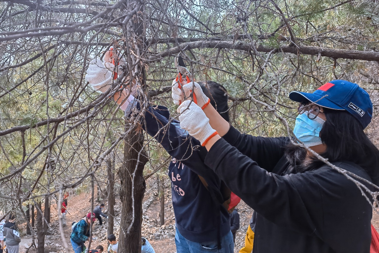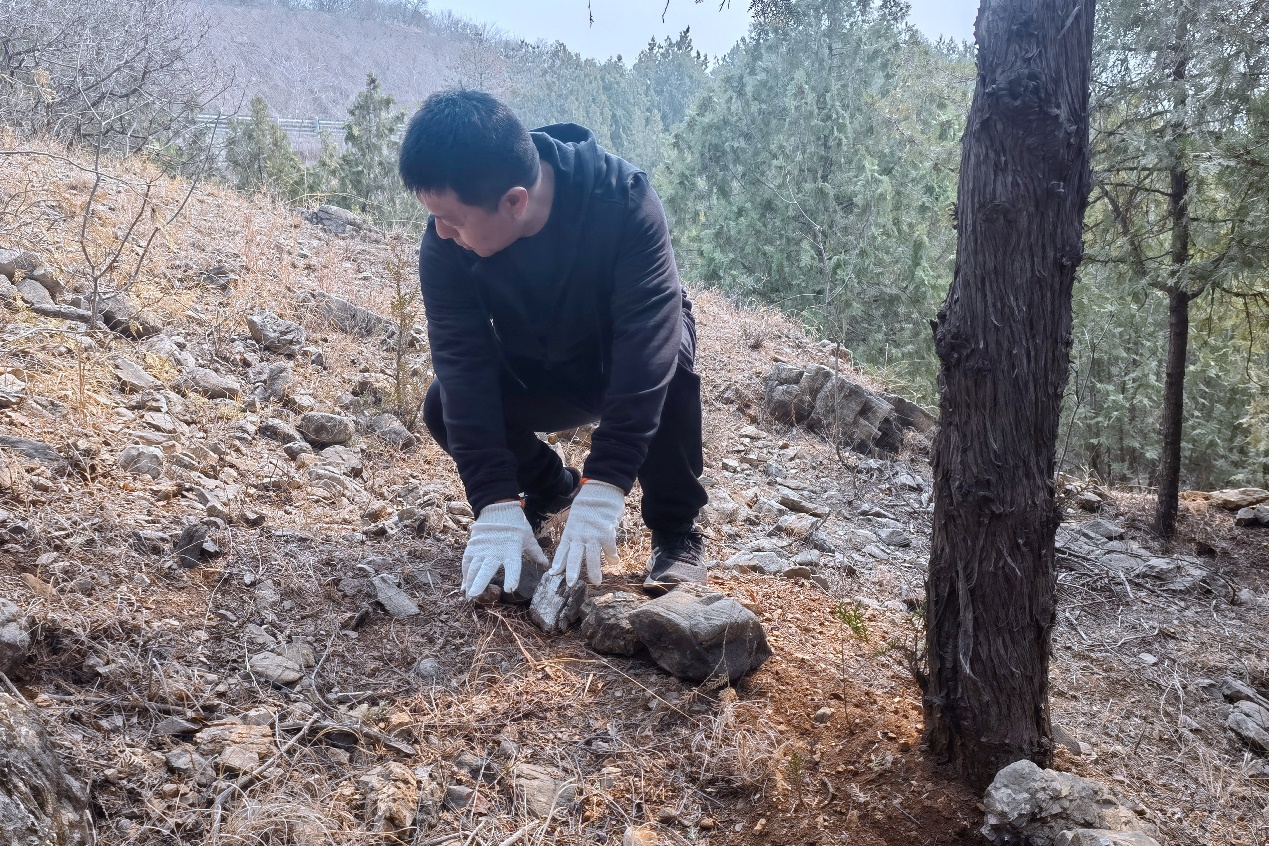 在“植树纪念碑”前,校园服务中心绿化环卫管理科荒山护林班班长、2021年“全国五一劳动奖章”获得者姚清明向大家详细介绍了北京大学荒山绿化基地近40年来的造林情况及取得的成就,并向大家介绍本次育林养护工作的主要内容:垒建修复树木周围的围挡石块,帮助树木更好地储蓄水分,同时修剪枯死的树枝。