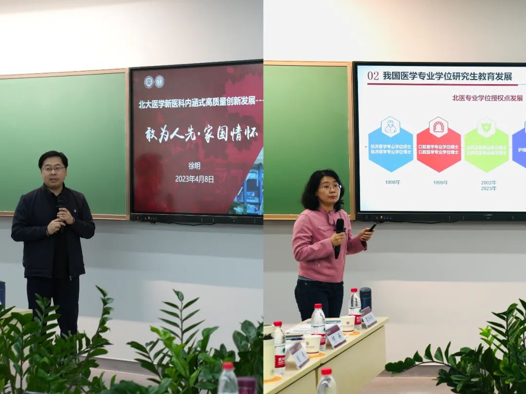 徐明以“敢为人先,家国天下”为主题,深入阐释了北大医学新医科内涵式高质量创新发展的目标定位、特色发展、颠覆创新和前瞻布局,并提出培养未来医学领军人才的具体举措。医学部分院副院长崔爽从住院医师规范化培训发展历程、卫教协同等方面详细介绍医学专业学位研究生教育发展情况,以及北大医学专业人才的培养特色。研究生院各办公室负责人分别围绕研究生招生计划管理、培养体系与培养理念、导师年度招生资格审核、前沿工程博士培养体系、宣传与信息化建设等重点工作,分享创新理念与举措。与会人员交流充分、讨论热烈,达到了增进了解、凝聚共识、促进融合的目的。