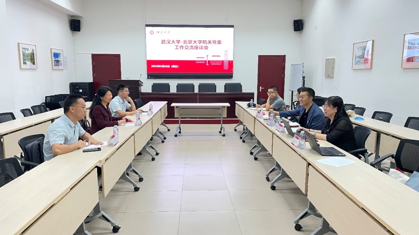 5月26日上午,机关党委在勺园5乙303会议室举办武汉大学-北京大学机关党委工作交流座谈会。武汉大学机关与直属单位党委书记谭玉敏,机关与直属单位党委副书记、纪委书记秦正保,机关与直属单位党委主任秘书、专职组织员蔡恒来校调研。北京大学机关党委书记刘旭东,机关党委副书记袁红利,校工会副主席、机关工会主席田越等参加座谈。双方就北京大学机关党委基本情况、创新性工作开展、下一阶段共建方向等相关事宜进行了深入讨论与交流。