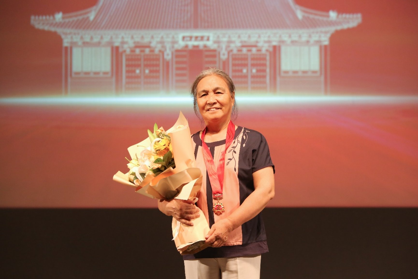 刘旭东为老党员代表颁发“光荣在党50年”纪念章,并向他们献花致敬。