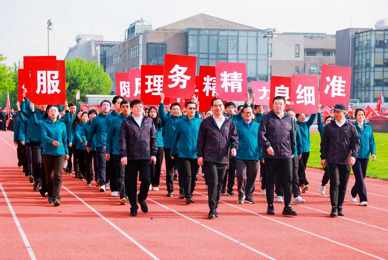 4月26日上午8时,伴随着激昂的《运动员进行曲》,各单位代表队依次入场。龚旗煌校长以及在京校领导带领机关工会队员迈着整齐的步伐,精神抖擞地率先步入赛场,齐声喊出铿锵有力的口号:“服务精准、管理精细、作风优良、保障有力!”这不仅是对自身职责的庄严承诺,更是对北大精神的深刻诠释。开幕式上,机关工会的老师和各单位的教职工一起以一场行云流水的集体八段锦表演惊艳全场,动作舒展如行云流水,一招一式间尽显中华传统养生之道的精髓,平日里,老师们将八段锦等健身活动融入工作间隙,在繁忙的工作之余坚持锻炼,以强健体魄支撑高效工作,用实际行动诠释了“文明其精神,野蛮其体魄”的深刻内涵。