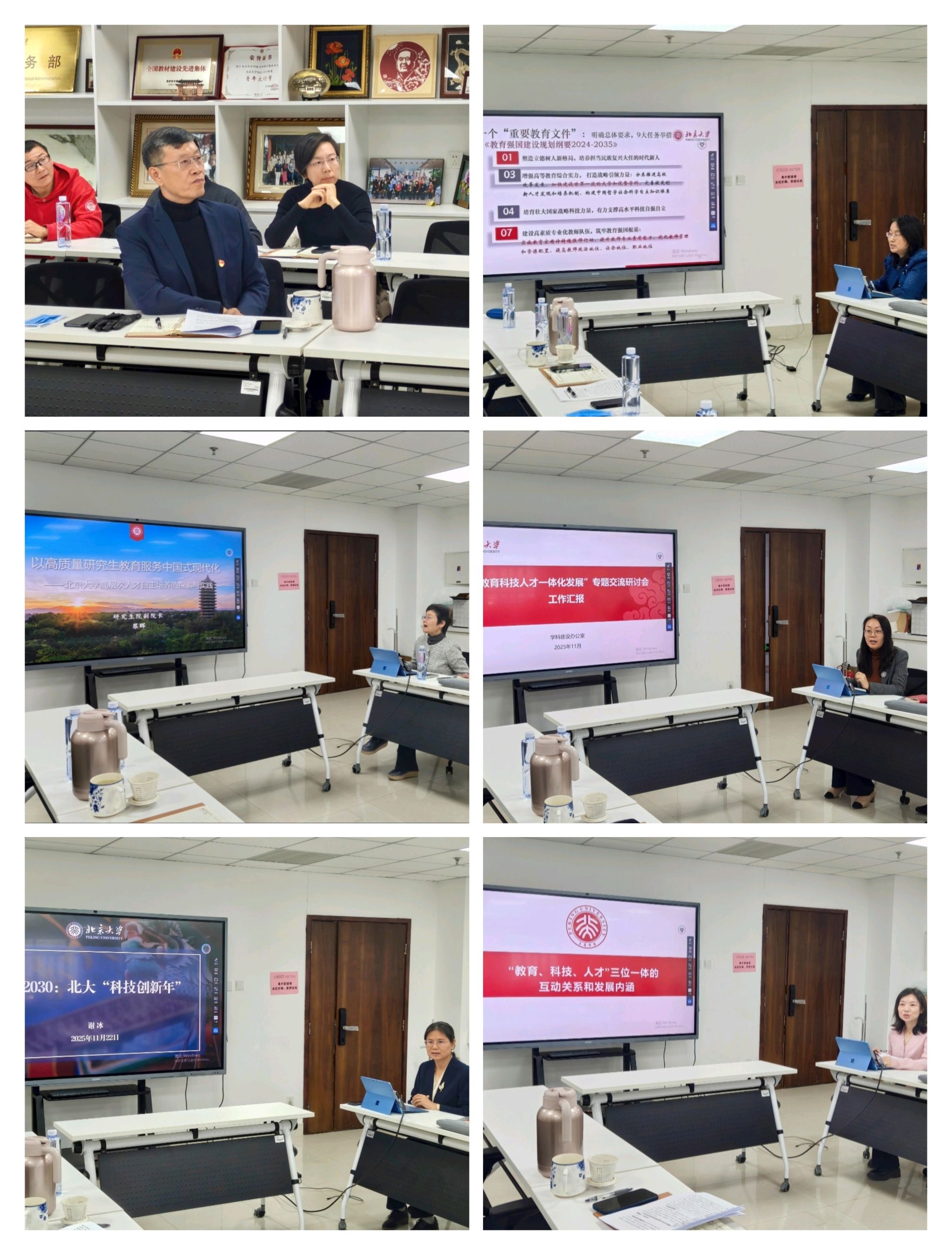 11月25日,机关党委召开“教育科技人才一体发展”专题交流研讨会暨党支部书记工作例会、“勺海论坛”。活动旨在深入学习领会习近平总书记和党中央关于教育、科技、人才一体发展的战略要求,引领带动机关认真贯彻落实党的二十大和二十届三中全会、四中全会精神,扎实开展巡视整改工作。会议邀请了人事部、研究生院、学科建设办公室、科学研究部、政策法规研究室等部门代表围绕会议主题作交流发言。机关党委委员、各部门党组织书记及群团组织负责人参加,机关党委书记刘旭东主持了会议。
