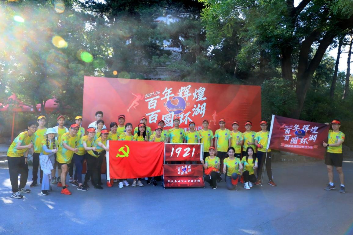 下午18:30,最后一组接力师生成功撞线。算上领跑的第一圈,33组师生每组跑三圈,正好是一百圈。百年大党风华正茂,百圈环湖致敬百年!